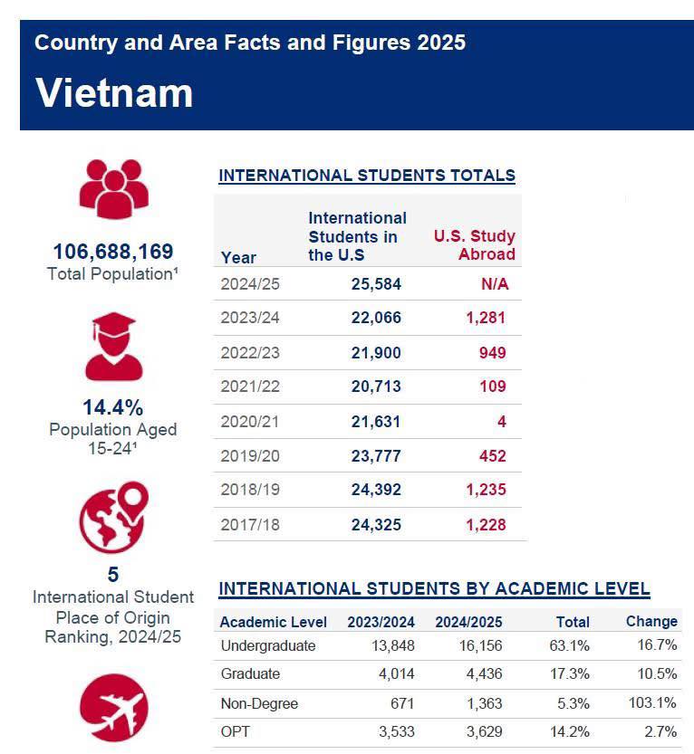 Năm học 2024–2025, có 25.584 sinh viên Việt Nam theo học tại các cơ sở giáo dục trên khắp Hoa Kỳ, đưa Việt Nam vào top 5 quốc gia có số lượng du học sinh tại Mỹ nhiều nhất.