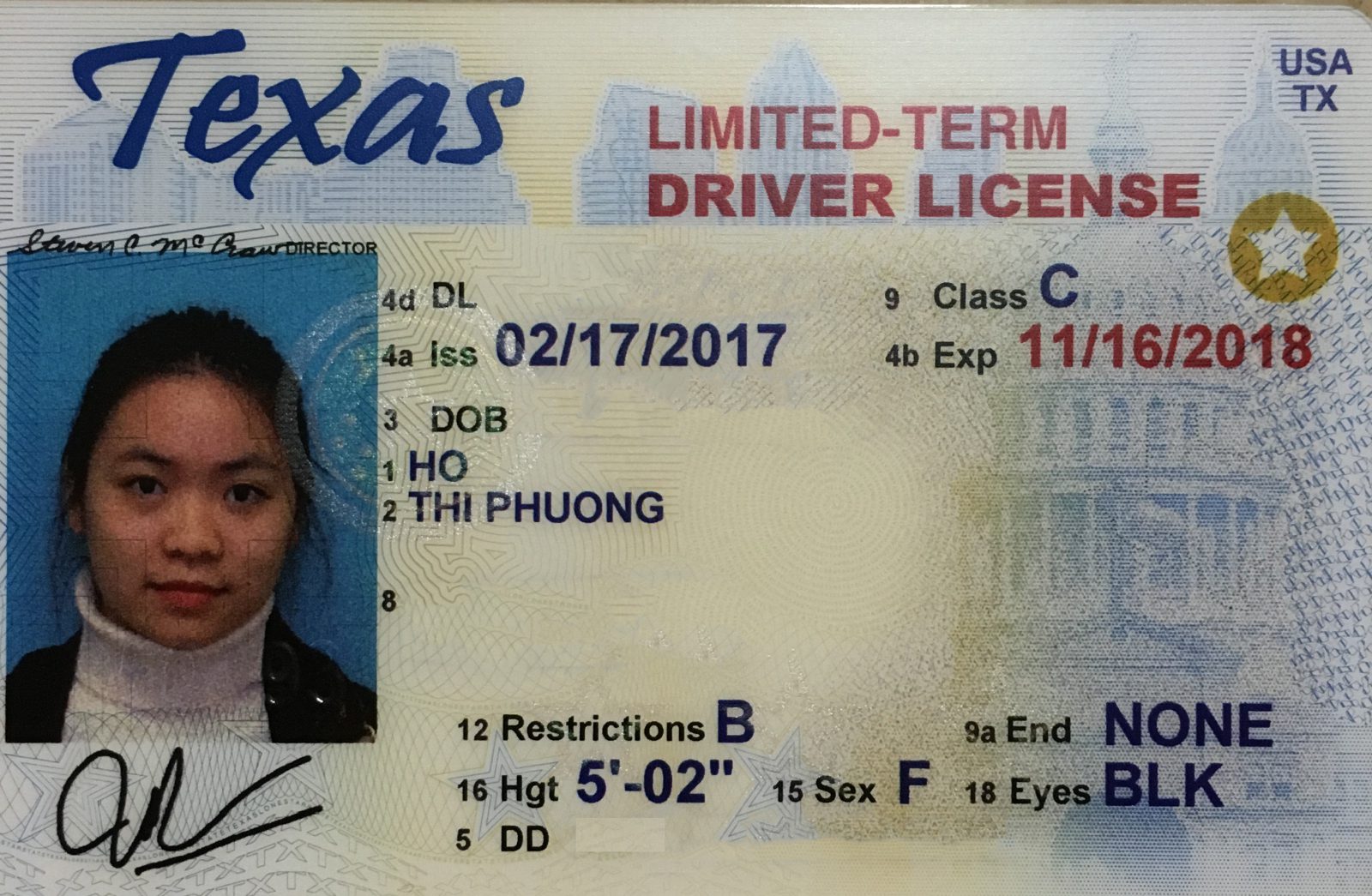 Giai đoạn tiếp theo sau khi có bằng lý thuyết là bạn sẽ phải đến văn phòng DPS để đăng ký nhận bằng tạm thời để tập lái. Các giấy tờ bạn cần chuẩn bị là I20, passport, form I94 và hai hoá đơn điện nước của nhà mà bạn đang thuê. Cộng với điều quan trọng là bạn cần chủ nhà đi cùng để ký tên xác nhận. Nên đặt hẹn trước (qua website của DPS nơi bạn ở) để tránh phải đợi lâu nhé. Phí để đăng ký bằng tạm là $25. Bạn đến đó và điền vào một form có sẵn, đợi đến số của mình rồi nộp giây tờ cho nhân viên tại đó. Họ sẽ xử lý rất nhanh, trong vòng 10 đến 15 phút là bạn đã có thể nhận được bằng tạm thời. Bạn bắt buộc phải có bằng này thì mới hợp pháp để tập lái xe. Với bằng này, người tập lái cho bạn phải là người có bằng lái từ 21 tuổi trở lên. Ở Mỹ, công dân từ 16 tuổi có thể học và thi bằng lái nhưng từ 16 đến 21 tuổi, bằng lái của họ sẽ có dạng hình chữ nhật đứng thay vì hình chữ nhật ngang như hình.
